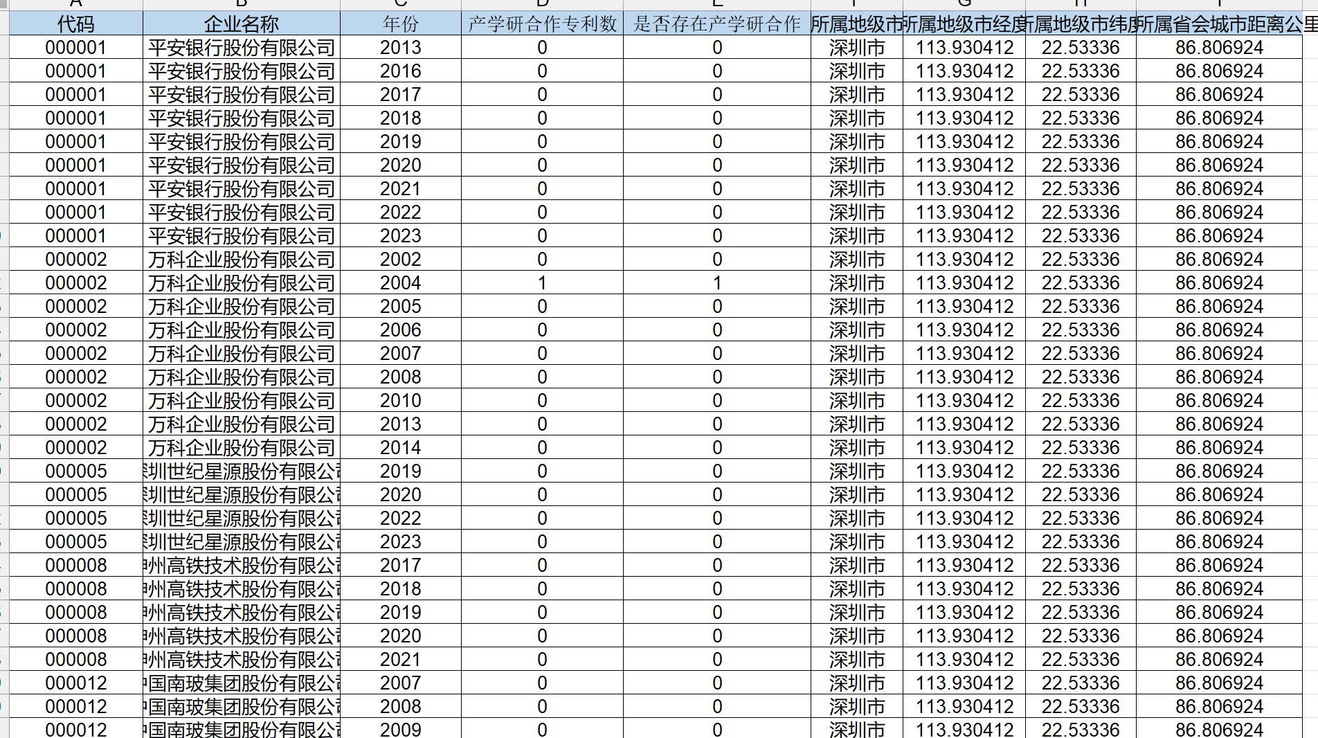 通过这些数据,可以深入了解上市公司在产学研合作方面的表现,包括他们取得的专利数量和地理位置对其合作关系的影响。这份数据集对于分析中国上市公司的创新能力、理解区域经济发展、以及评估产学研合作对企业创新和区域发展的贡献具有参考价值。它为投资者、政策制定者、学者及企业战略规划提供了一定的数据支持和洞察。