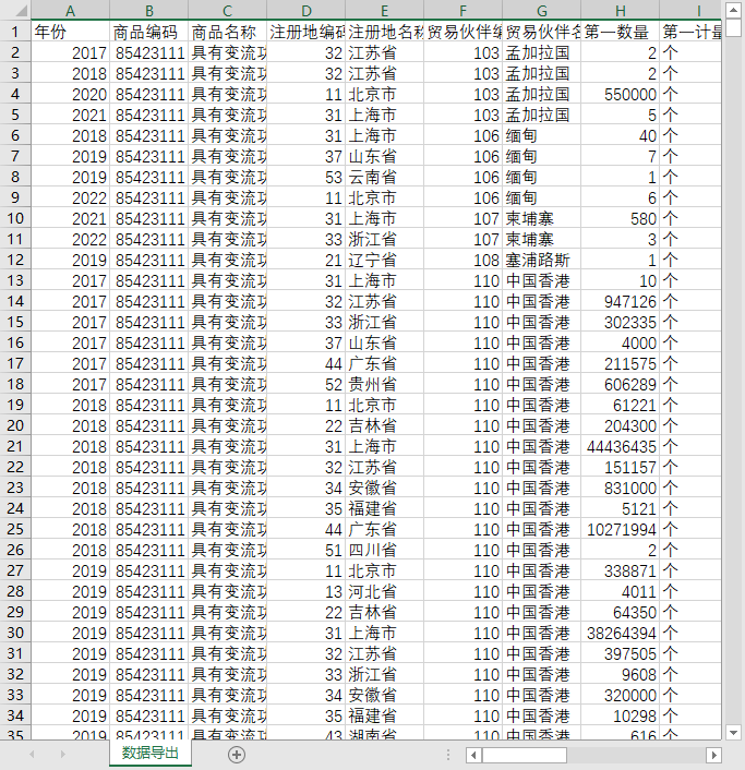 数据范围:各省份(注册地名称),分别明细到 全球世界各国(贸易伙伴名称) 的贸易数据,明细到HS分类的8位编码