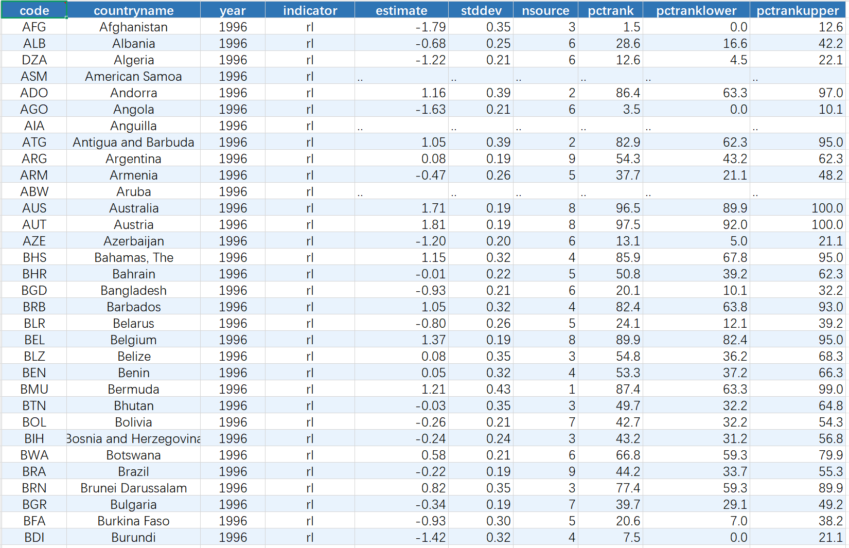 estimate | 治理估计值 | 标准正态分布,范围约[-2.5, 2.5] |