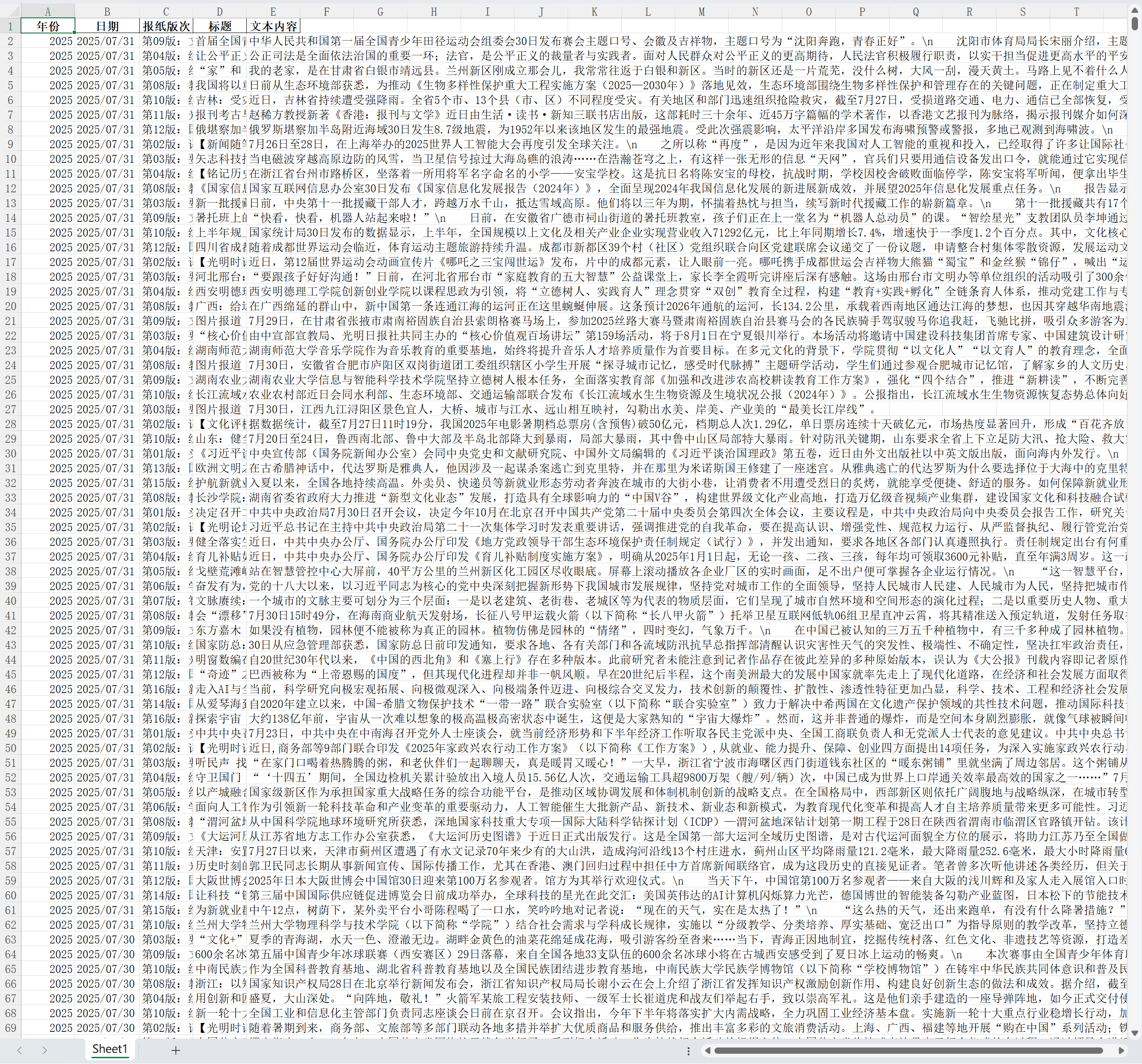《光明日报》新闻文本数据库收录了《光明日报》1985年-2025年7月31日期间公开的新闻历史文本数据,并将所有文本整理为一张表格。包括完整版、分年版,该文本数据根据公开新闻整理,仅用于学术研究