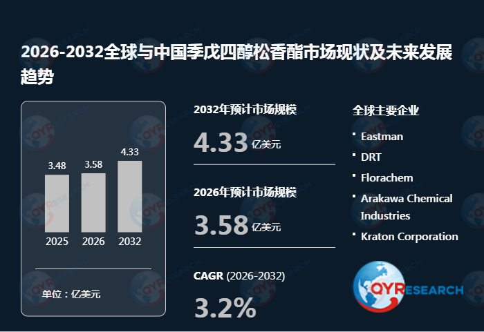 根据QYResearch(北京恒州博智国际信息咨询有限公司)的统计及预测,2025年全球季戊四醇松香酯市场销售额达到了3.48亿美元,预计2032年将达到4.33亿美元,年复合增长率(CAGR)为3.2%(2026-2032)。