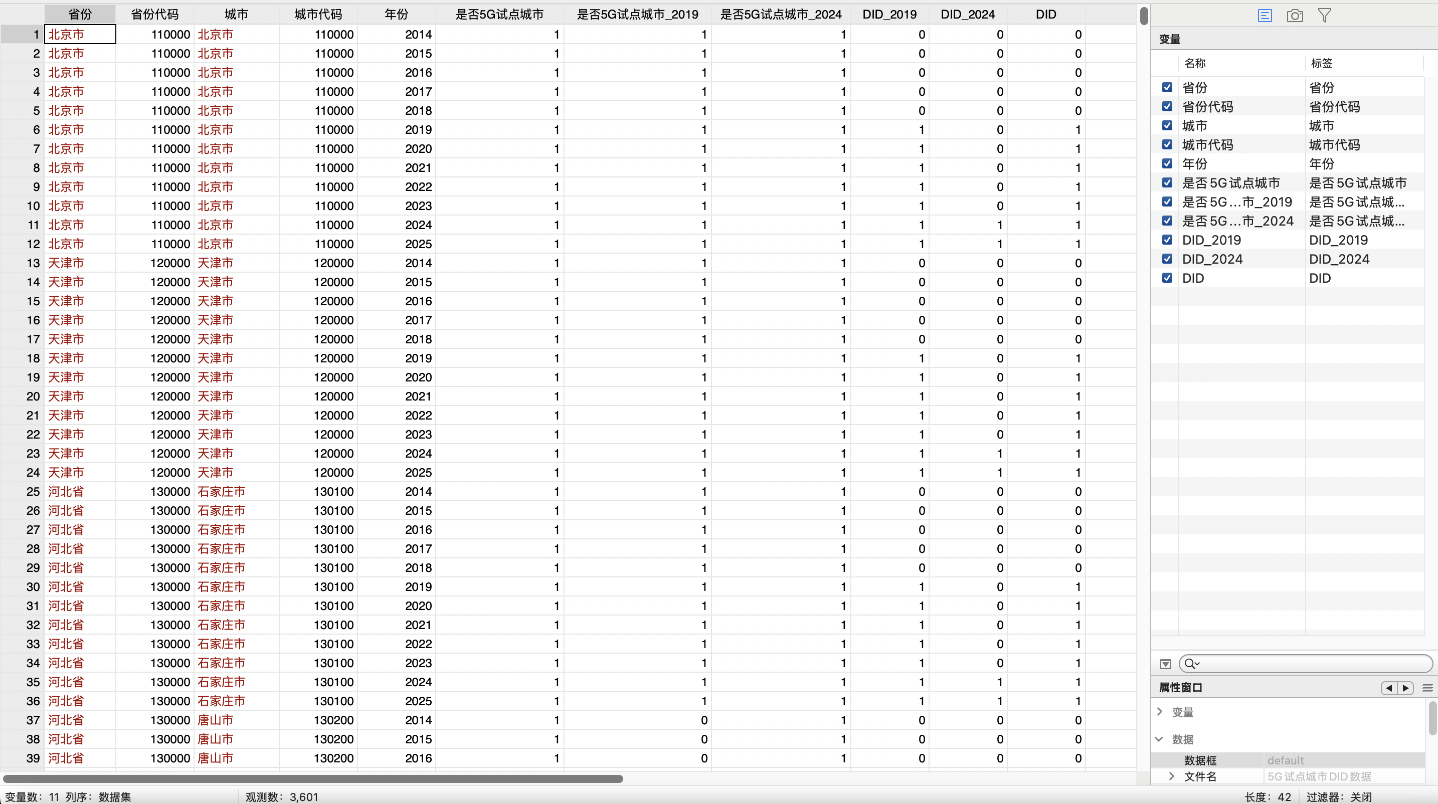 构造5G试点城市DID数据操作步骤:1.确定试点时间与名单2.构造哑变量Treat = 1(城市是试点城市),否则 0Post = 1(政策启动年及以后),否则 0DID = Treat × Post