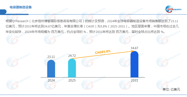 根据QYResearch最新调研报告显示,预计2032年全球电容器制造设备市场规模将达到3648百万美元,未来几年年复合增长率CAGR为5.8%。