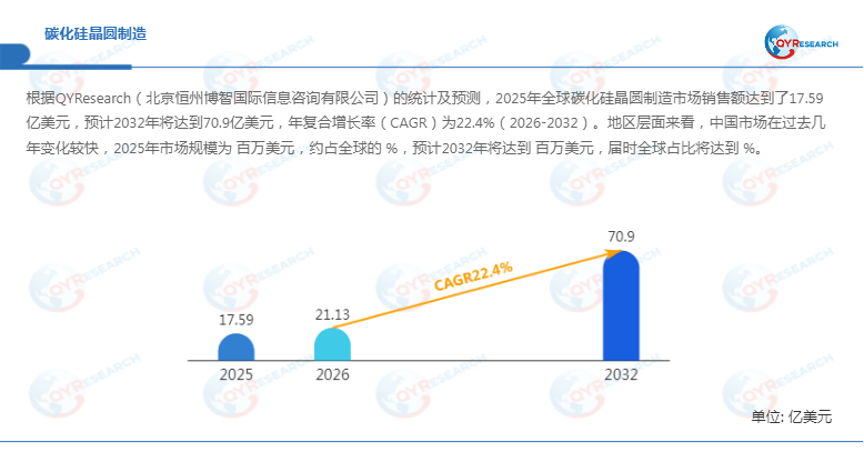 根据QYResearch最新调研报告显示,预计2032年全球碳化硅晶圆制造市场规模将达到7090百万美元,未来几年年复合增长率CAGR为22.36%。