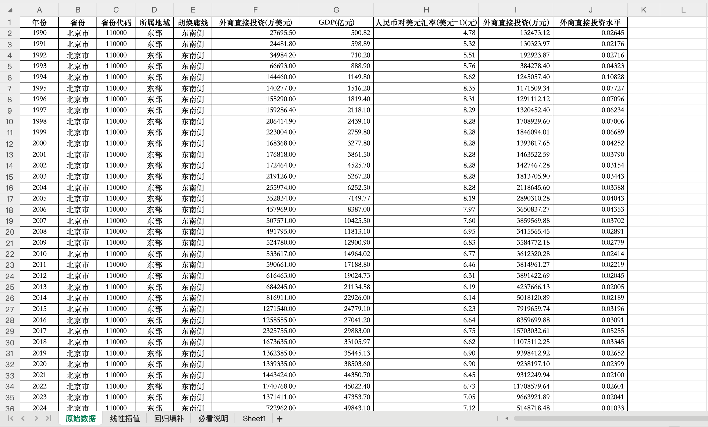全国各省-外商直接投资水平(1990-2024年)