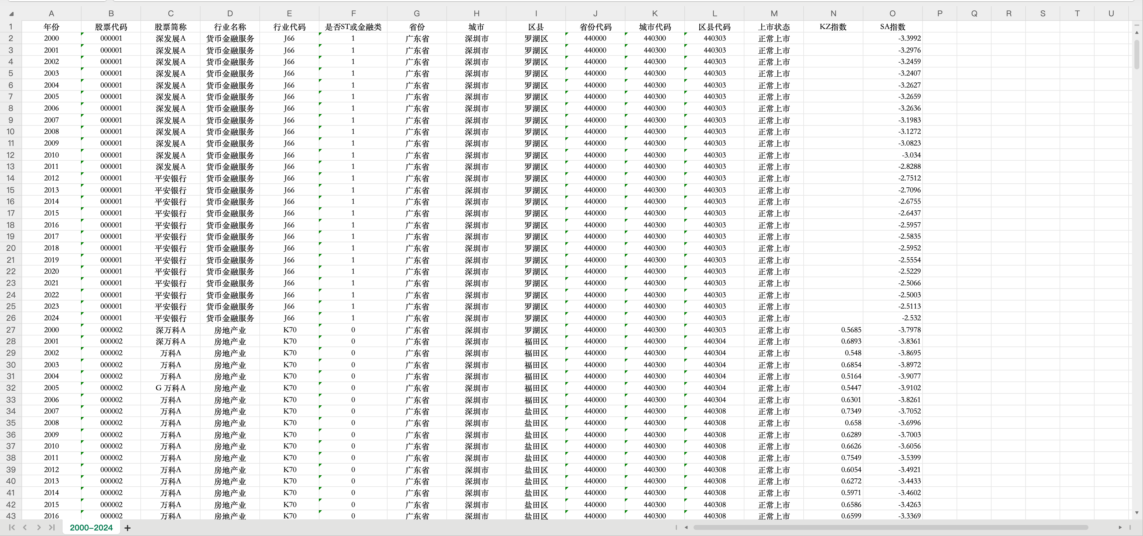 SA指数由Hadlock和Pierce提出,其计算公式为 SA=-0.737size+0.043size²-0.040*age,其中size表示企业总资产规模的自然对数,age为企业经营年度。SA指数基于公司的规模和年龄来计算,通常较小且较年轻的公司会有更高的指数值,表明其融资约束较大