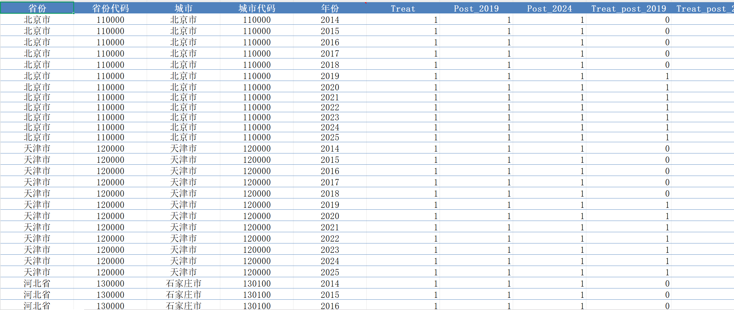 Treat_post_2024 该城市当年是否在2024年5G试点名单中,若是为1,否则为0