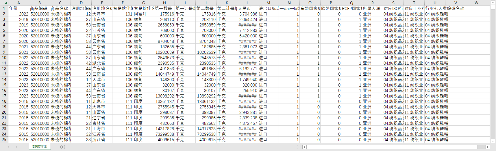 全国31个省份棉花进出口全球世界各国数据2015-2025未梳已梳棉花废棉缝纫线印花棉布多股纱线色织漂白平纹布染色布等等