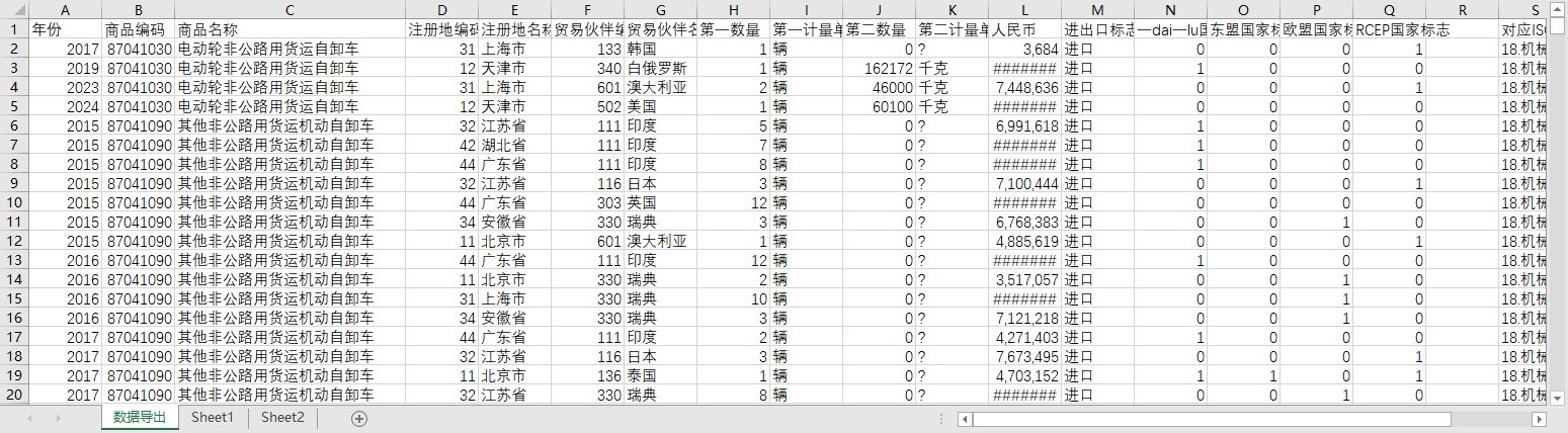 数据范围:各省份(注册地名称),分别明细到 全球世界各国(贸易伙伴名称) 的贸易数据,明细到HS分类的8位编码