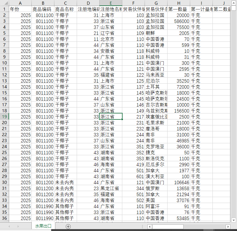 全国31个省份水果进出口2015-2025干椰枣扁桃仁香蕉菠萝梨葡萄柚西瓜草莓李子榴莲鲜番荔枝龙眼柿子木莓黑莓桑椹罗甘莓穗醋栗等全球世界各国
