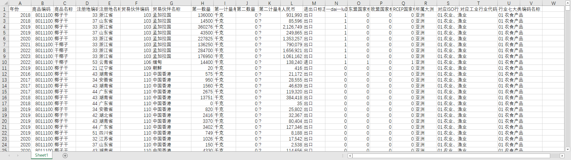 年份 商品编码 商品名称 注册地编码 注册地名称 贸易伙伴编码 贸易伙伴名称 第一数量 第一计量单位 第二数量 第二计量单位 人民币 进出口标志 一dai一lu国家标志 东盟国家标志 欧盟国家标志 RCEP国家标志 所属大洲 对应ISO行业分类 对应工业行业代码名称 行业七大类编码名称
