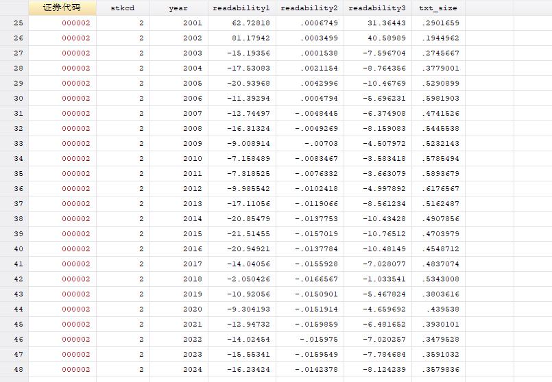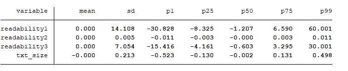 | readabilityl | 可读性指标1 | 年报中每个分句的平均字数减去行业平均值 |