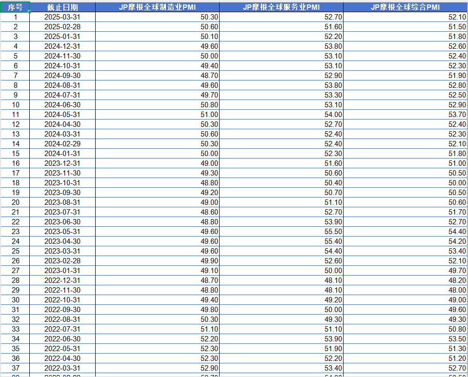本次以JP摩根全球制造业PMI、JP摩根全球服务业PMI、JP摩根全球综合PMI作为全球经济景气衡量指标,该指标以50为临界点,超过50代表扩张,低于50表示收缩。数据时间为2009年10月-2025年3月,为月度数据,可帮助研究者和政策制定者洞察全球经济走向