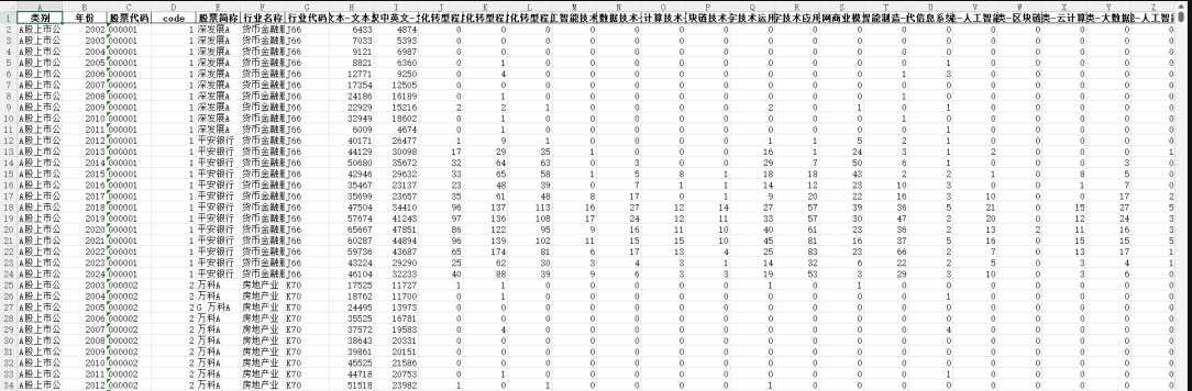 数字化转型A:参考《管理世界》中吴非(2021)的做法,团队对人工智能技术、大数据技术、云计算技术、区块链技术、数字技术运用五个维度76个数字化相关词频进行统计