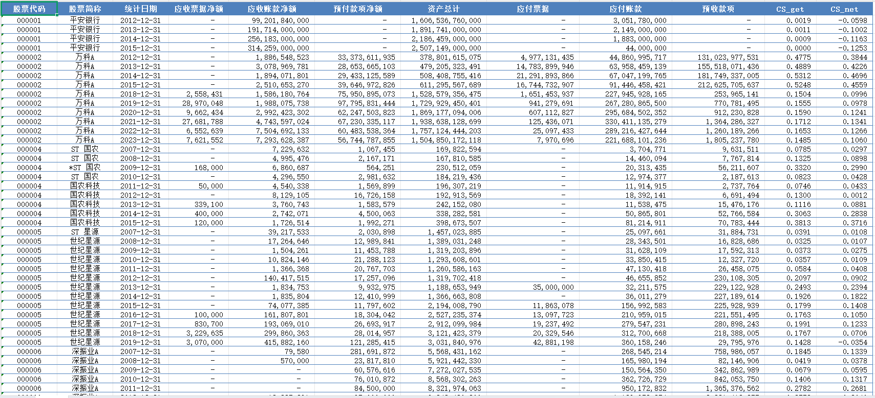 2、供应链成本分摊净额(CS_net)=(应付账款 + 应付票据 + 预收账款 - 应收账款 - 应收票据 - 预付账款)/总资产