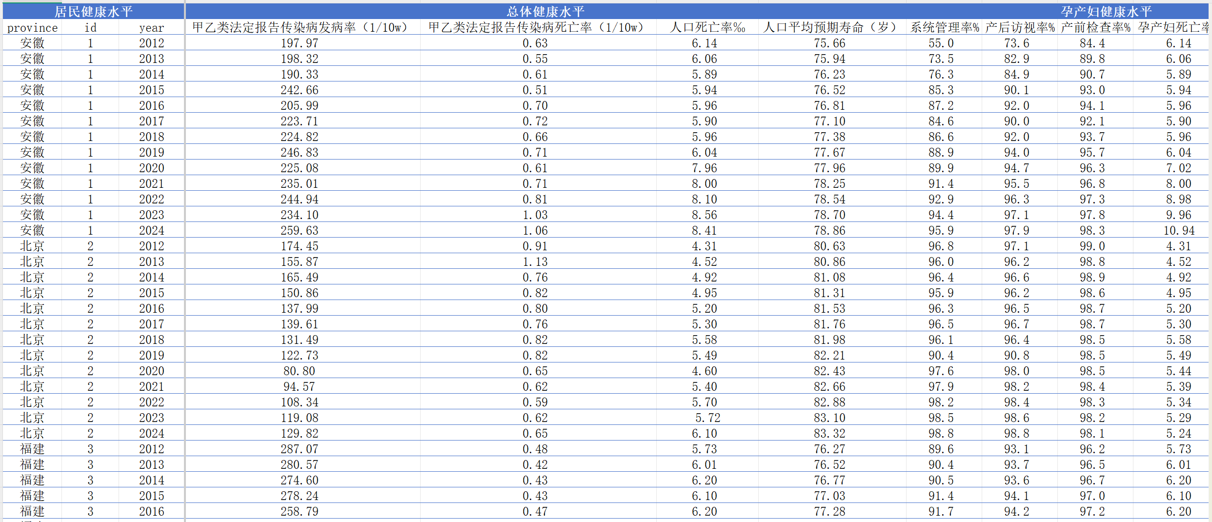 中国31省居民健康与医疗卫生水平数据(2012-2024年)