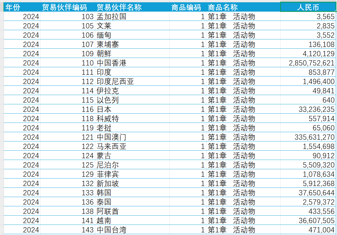 中国与世界各国农产品进出口贸易数据(2015-2024年)