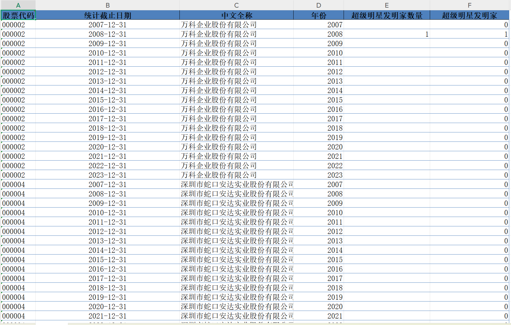 数据名称:A股上市公司超级明星发明家数据