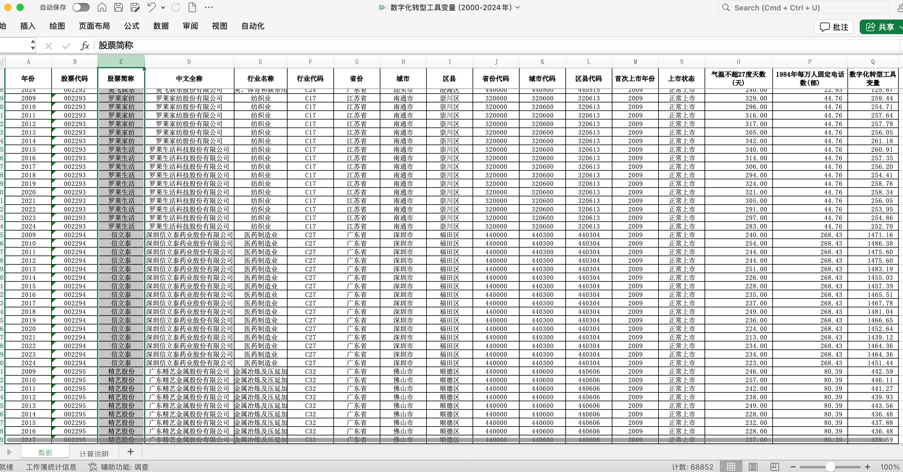 上市公司数字化转型工具变量数据(2000-2024年,A股上市公司68851条,气温适宜天数×历史固定电话密度构建IV)