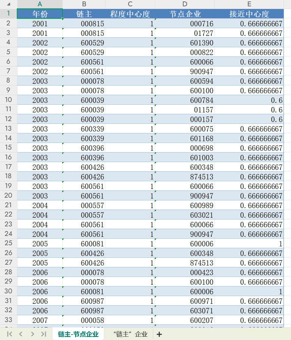本次分享的数据是2001-2024年上市公司-“链主”企业数据。利用各年度样本公司供应商和客户信息,计算上市公司-“链主”企业数据,包括链主、程度中心度、节点企业、接近中心度