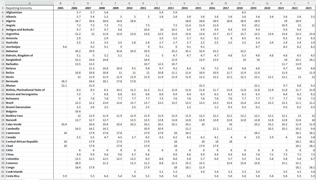 本次分享的是世界各国关税的历史关税数据,来源为WTO,数据年份为2005-2023年