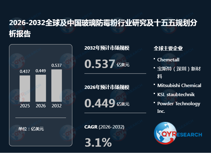 QYResearch调研显示,2025年全球玻璃防霉粉市场规模大约为0.44亿美元,预计2032年将达到0.54亿美元,2026-2032期间年复合增长率(CAGR)为3.1%。