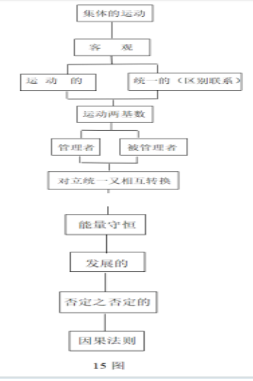 15 图呈现的是研究集体运动学的一般思维逻辑及方法。因此我们可以说,所谓方法论:就是在世界运动底层逻辑的基础上,形成的对各门各类具体学科进行深入研究与思考的方法。不同的是,在对具体科学进行研究与思考时,我们要找到两基素的具体对像。如15图对集体运动学的研究中,我们要找到集体运动的两基素,管理者与被管理者。之后去认识历史以来,管理者与被管理者在对立统一运动中各种现象,通过对无限多现象中去尽可能把握管理者与被管理者矛盾运动中的本质,认识其运动的一般规律。以此找到此两者实现持久的良性运动(也可称为平衡运动)的这个平衡点。——