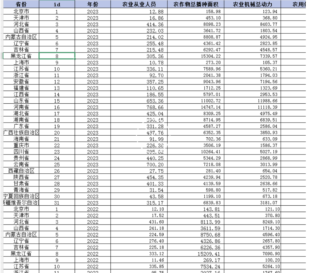 省份 id 年份 农业从业人员 农作物总播种面积 农业机械总动力 农用化肥投入 农药使用量 农用塑料薄膜使用量 农业有效灌溉面积 2005年为基准的农业总产值 农业全要素生产率1 2011年为基准的农业总产值 农业全要素生产率2 2012年为基准的农业总产值 农业全要素生产率3