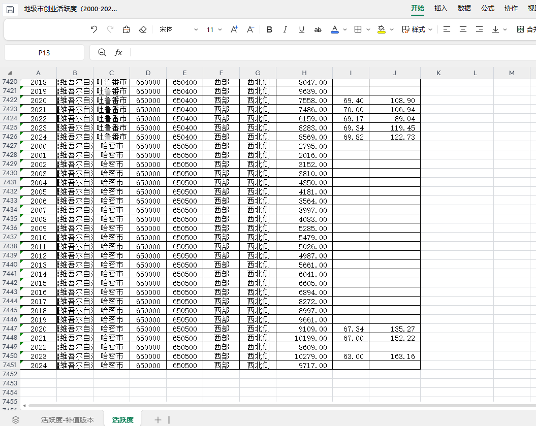 包含指标:年份 省份 城市 省份代码 城市代码 所属地域 胡焕庸线 注册企业数 常住人口数(万人) 创业活跃度