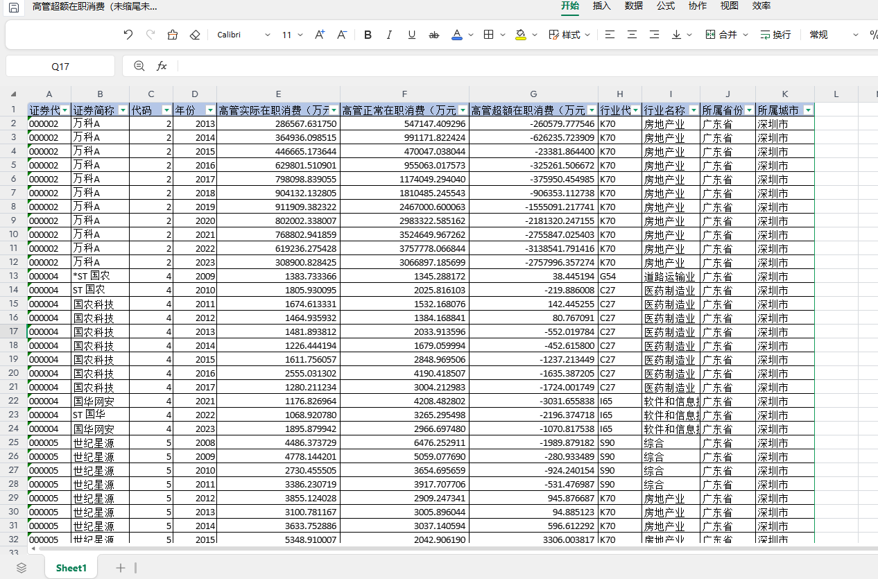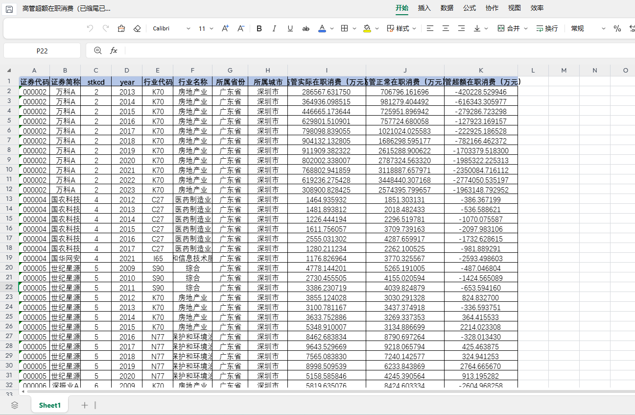 包含指标:证券代码 证券简称 代码 年份 行业代码 行业名称 所属省份 所属城市 高管实际在职消费(万元) 高管正常在职消费(万元) 高管超额在职消费(万元)
