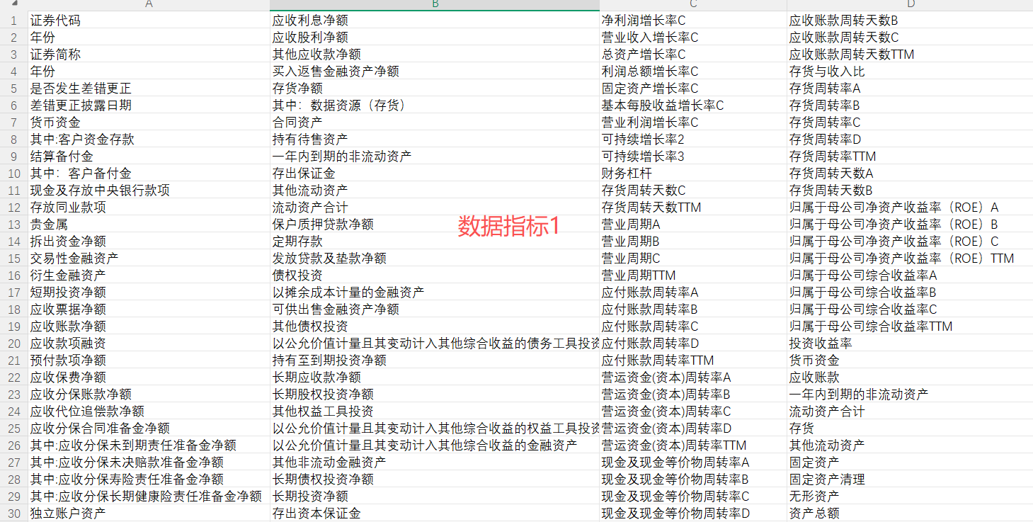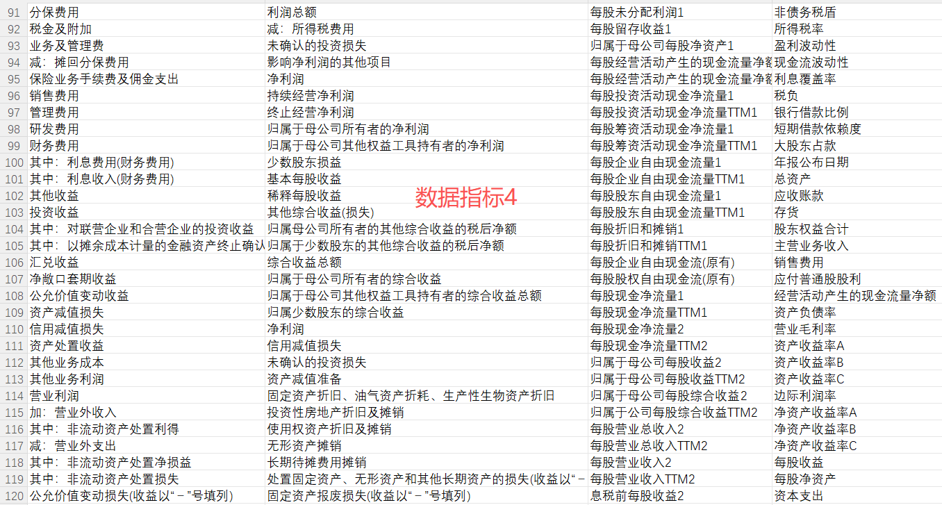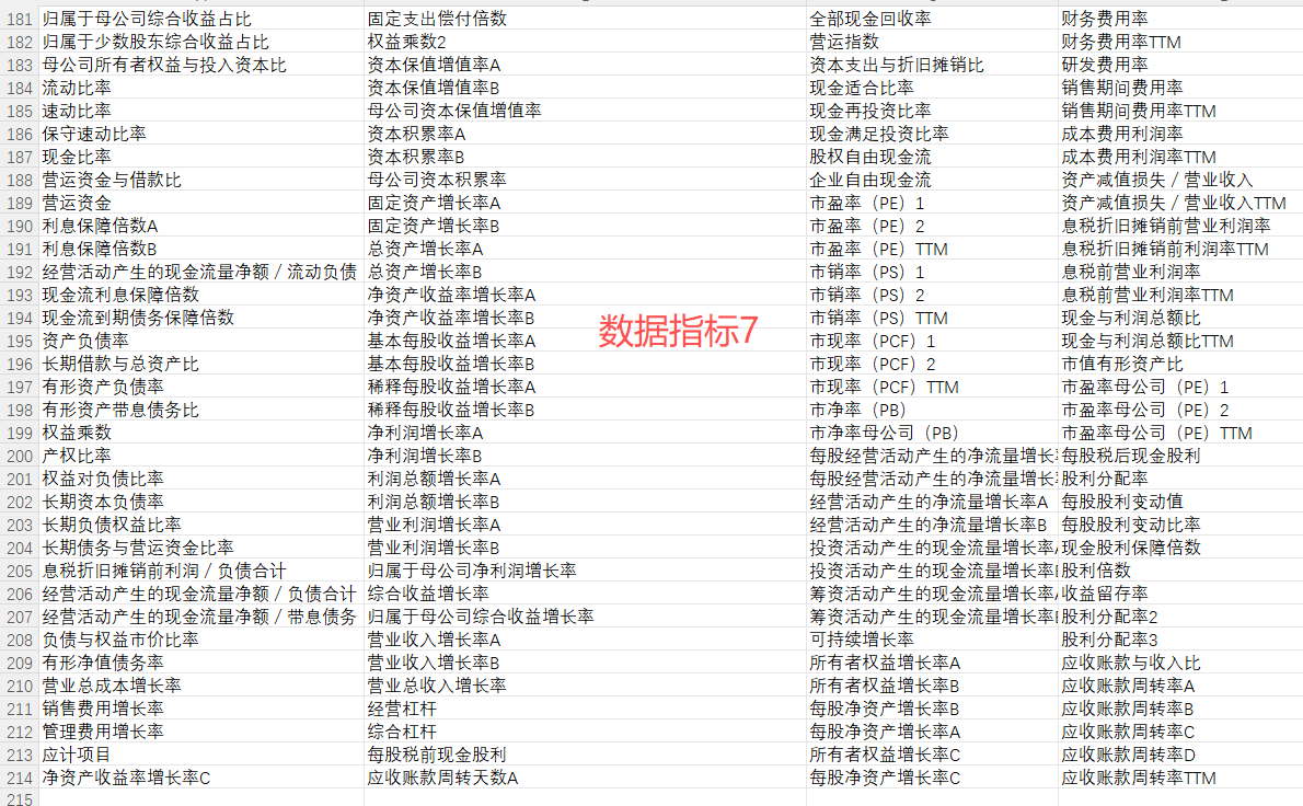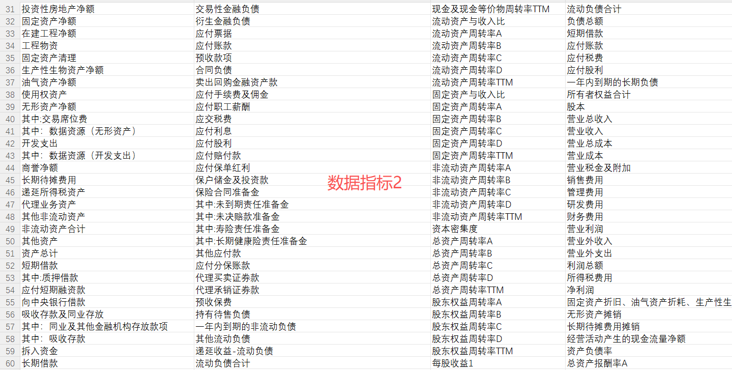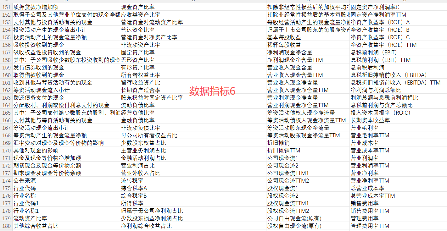 资本密集度、存货净额、流动负债、总负债、营业收入、资产负债率、营业成本、销售费用、管理费用、营业利润、净利润、资产负债率、流动资产比率、流动负债率、流动比率、速动比率、现金比率、资产负债率、总资产报酬率 总资产净利润率 净资产收益率、市值、存货周转率、应收账款、资产收益率、每股收益、总资产增长率、托宾Q值、财务杠杆、经营杠杆、存货周转天数、应收账款周转率、流动资产周转率、资产收益率、总资产周转率、市净率、市盈率、资本支出、无形资产摊销、经营活动产生的现金流量净额等超600多个财务指标