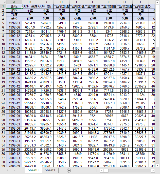 指标 GDP_当期 GDP_累计 第一产业增加值_当期 第一产业增加值_累计 第二产业增加值_当期 第二产业增加值_累计 第三产业增加值_当期 第三产业增加值_累计 行业增加值_农、林、牧、渔业_当期 行业增加值_农、林、牧、渔业_累计 工业增加值_当期 工业增加值_累计 行业增加值_制造业_当期 行业增加值_制造业_累计 行业增加值_建筑业_当期 行业增加值_建筑业_累计 行业增加值_批发和零售业_当期 行业增加值_批发和零售业_累计 行业增加值_交通运输、仓储和邮政业_当期 行业增加值_交通运输、仓储和邮政业_累计 行业增加值_住宿和餐饮业_当期 行业增加值_住宿和餐饮业_累计 行业增加值_金融业_当期 行业增加值_金融业_累计 行业增加值_房地产业_当期 行业增加值_房地产业_累计 行业增加值_信息传输、软件和信息技术服务业_当期 行业增加值_信息传输、软件和信息技术服务业_累计 行业增加值_租赁和商务服务业_当期 行业增加值_租赁和商务服务业_累计 行业增加值_其他行业_当期 行业增加值_其他行业_累计 GDP(不变价)_当期 GDP(不变价)_累计 第一产业增加值(不变价)_当期 第一产业增加值(不变价)_累计 第二产业增加值(不变价)_当期 第二产业增加值(不变价)_累计 第三产业增加值(不变价)_当期 第三产业增加值(不变价)_累计 GDP增长指数(上年同期=100)_当期 GDP增长指数(上年同期=100)_累计 第一产业增加值增长指数(上年同期=100)_当期 第一产业增加值增长指数(上年同期=100)_累计 第二产业增加值增长指数(上年同期=100)_当期 第二产业增加值增长指数(上年同期=100)_累计 第三产业增加值增长指数(上年同期=100)_当期 第三产业增加值增长指数(上年同期=100)_累计 行业增加值增长指数(上年同期=100)_农、林、牧、渔业_当期 行业增加值增长指数(上年同期=100)_农、林、牧、渔业_累计 工业增加值增长指数(上年同期=100)_当期 工业增加值增长指数(上年同期=100)_累计 行业增加值增长指数(上年同期=100)_制造业_当期 行业增加值增长指数(上年同期=100)_制造业_累计 行业增加值增长指数(上年同期=100)_建筑业_当期 行业增加值增长指数(上年同期=100)_建筑业_累计 行业增加值增长指数(上年同期=100)_批发和零售业_当期 行业增加值增长指数(上年同期=100)_批发和零售业_累计 行业增加值增长指数(上年同期=100)_交通运输、仓储和邮政业_当期 行业增加值增长指数(上年同期=100)_交通运输、仓储和邮政业_累计 行业增加值增长指数(上年同期=100)_住宿和餐饮业_当期 行业增加值增长指数(上年同期=100)_住宿和餐饮业_累计 行业增加值增长指数(上年同期=100)_金融业_当期 行业增加值增长指数(上年同期=100)_金融业_累计 行业增加值增长指数(上年同期=100)_房地产业_当期 行业增加值增长指数(上年同期=100)_房地产业_累计 行业增加值增长指数(上年同期=100)_信息传输、软件和信息技术服务业_当期 行业增加值增长指数(上年同期=100)_信息传输、软件和信息技术服务业_累计 行业增加值增长指数(上年同期=100)_租赁和商务服务业_当期 行业增加值增长指数(上年同期=100)_租赁和商务服务业_累计 行业增加值增长指数(上年同期=100)_其他行业_当期 行业增加值增长指数(上年同期=100)_其他行业_累计 GDP_当期环比增速 最终消费支出对GDP的贡献率_当期 最终消费支出对GDP的贡献率_累计 资本形成总额对GDP的贡献率_当期 资本形成总额对GDP的贡献率_累计 货物和服务净出口对GDP的贡献率_当期 货物和服务净出口对GDP的贡献率_累计 GDP贡献率_当期 GDP贡献率_累计 第一产业对GDP的贡献率_当期 第一产业对GDP的贡献率_累计 第二产业对GDP的贡献率_当期 第二产业对GDP的贡献率_累计 第三产业对GDP的贡献率_当期 第三产业对GDP的贡献率_累计 居民消费支出中货物消费占比_累计 居民消费支出中服务消费占比_累计