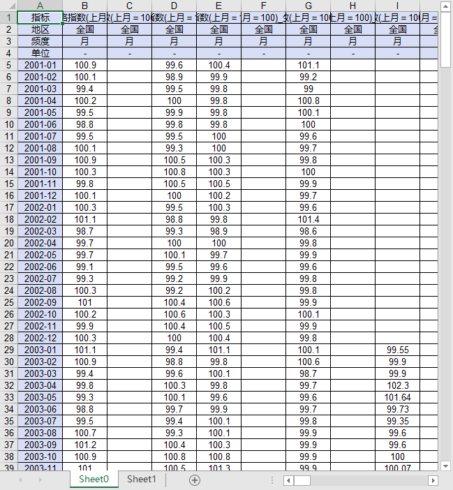 指标 居民消费价格指数(上月=100)_当期 居民消费价格指数(上月=100)_食品烟酒_当期 居民消费价格指数(上月=100)_衣着_当期 居民消费价格指数(上月=100)_居住_当期 居民消费价格指数(上月=100)_生活用品及服务_当期 居民消费价格指数(上月=100)_交通通信_当期 居民消费价格指数(上月=100)_教育文化娱乐_当期 居民消费价格指数(上月=100)_医疗保健_当期 居民消费价格指数(上月=100)_其他用品及服务_当期 居民消费价格指数(上月=100)_食品_当期 居民消费价格指数(上月=100)_粮食_当期 居民消费价格指数(上月=100)_畜肉类_当期 居民消费价格指数(上月=100)_蛋类_当期 居民消费价格指数(上月=100)_水产品_当期 居民消费价格指数(上月=100)_鲜菜_当期 居民消费价格指数(上月=100)_鲜果_当期 居民消费价格指数(上月=100)_食用油_当期 居民消费价格指数(上月=100)_猪肉_当期 居民消费价格指数(上月=100)_牛肉_当期 居民消费价格指数(上月=100)_羊肉_当期 居民消费价格指数(上月=100)_奶类_当期 居民消费价格指数(上月=100)_卷烟_当期 居民消费价格指数(上月=100)_酒类_当期 城市居民消费价格指数(上月=100)_当期 城市居民消费价格指数(上月=100)_食品烟酒_当期 城市居民消费价格指数(上月=100)_衣着_当期 城市居民消费价格指数(上月=100)_居住_当期 城市居民消费价格指数(上月=100)_生活用品及服务_当期 城市居民消费价格指数(上月=100)_交通通信_当期 城市居民消费价格指数(上月=100)_教育文化娱乐_当期 城市居民消费价格指数(上月=100)_医疗保健_当期 城市居民消费价格指数(上月=100)_其他用品及服务_当期 城市居民消费价格指数(上月=100)_粮食_当期 城市居民消费价格指数(上月=100)_畜肉类_当期 城市居民消费价格指数(上月=100)_蛋类_当期 城市居民消费价格指数(上月=100)_水产品_当期 城市居民消费价格指数(上月=100)_鲜菜_当期 城市居民消费价格指数(上月=100)_鲜果_当期 农村居民消费价格指数(上月=100)_当期 农村居民消费价格指数(上月=100)_食品烟酒_当期 农村居民消费价格指数(上月=100)_衣着_当期 农村居民消费价格指数(上月=100)_居住_当期 农村居民消费价格指数(上月=100)_生活用品及服务_当期 农村居民消费价格指数(上月=100)_交通通信_当期 农村居民消费价格指数(上月=100)_教育文化娱乐_当期 农村居民消费价格指数(上月=100)_医疗保健_当期 农村居民消费价格指数(上月=100)_其他用品及服务_当期 农村居民消费价格指数(上月=100)_粮食_当期 农村居民消费价格指数(上月=100)_畜肉类_当期 农村居民消费价格指数(上月=100)_蛋类_当期 农村居民消费价格指数(上月=100)_水产品_当期 农村居民消费价格指数(上月=100)_鲜菜_当期 农村居民消费价格指数(上月=100)_鲜果_当期 居民消费价格指数(上月=100)_服装_当期 居民消费价格指数(上月=100)_鞋类_当期 居民消费价格指数(上月=100)_租赁房房租_当期 居民消费价格指数(上月=100)_水、电、燃料_当期 居民消费价格指数(上月=100)_家用器具_当期 居民消费价格指数(上月=100)_家庭服务_当期 居民消费价格指数(上月=100)_交通工具_当期 居民消费价格指数(上月=100)_交通工具用燃料_当期 居民消费价格指数(上月=100)_交通工具使用和维修_当期 居民消费价格指数(上月=100)_通信工具_当期 居民消费价格指数(上月=100)_通信服务_当期 居民消费价格指数(上月=100)_邮递服务_当期 居民消费价格指数(上月=100)_教育服务_当期 居民消费价格指数(上月=100)_旅游_当期 居民消费价格指数(上月=100)_中药_当期 居民消费价格指数(上月=100)_西药_当期 居民消费价格指数(上月=100)_医疗服务_当期