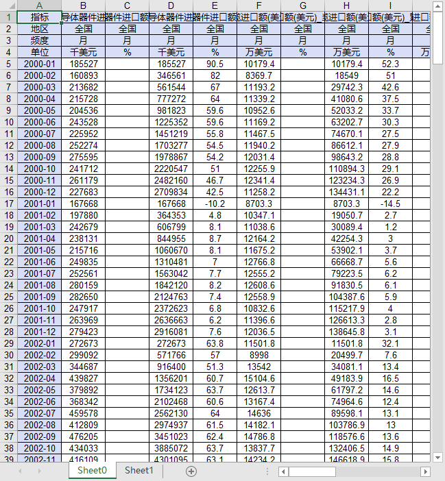 指标 二极管及类似半导体器件进口额(美元)_当期 二极管及类似半导体器件进口额(美元)_当期同比增速 二极管及类似半导体器件进口额(美元)_累计 二极管及类似半导体器件进口额(美元)_累计同比增速 电线电缆进口额(美元)_当期 电线电缆进口额(美元)_当期同比增速 电线电缆进口额(美元)_累计 电线电缆进口额(美元)_累计同比增速 蓄电池进口额(美元)_当期 蓄电池进口额(美元)_当期同比增速 蓄电池进口额(美元)_累计 蓄电池进口额(美元)_累计同比增速 二极管及类似半导体器件进口量_当期 二极管及类似半导体器件进口量_当期同比增速 二极管及类似半导体器件进口量_累计 二极管及类似半导体器件进口量_累计同比增速 电线电缆进口量_当期 电线电缆进口量_当期同比增速 电线电缆进口量_累计 电线电缆进口量_累计同比增速 蓄电池进口量_当期 蓄电池进口量_当期同比增速 蓄电池进口量_累计 蓄电池进口量_累计同比增速