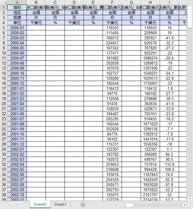 指标 二甲苯进口额(美元)_当期 二甲苯进口额(美元)_当期同比增速 二甲苯进口额(美元)_累计 二甲苯进口额(美元)_累计同比增速 肥料进口额(美元)_当期 肥料进口额(美元)_当期同比增速 肥料进口额(美元)_累计 肥料进口额(美元)_累计同比增速 矿物肥料及化肥进口额(美元)_当期 矿物肥料及化肥进口额(美元)_当期同比增速 矿物肥料及化肥进口额(美元)_累计 矿物肥料及化肥进口额(美元)_累计同比增速 氯化钾进口额(美元)_当期 氯化钾进口额(美元)_当期同比增速 氯化钾进口额(美元)_累计 氯化钾进口额(美元)_累计同比增速 氮磷钾三元复合肥进口额(美元)_当期 氮磷钾三元复合肥进口额(美元)_当期同比增速 氮磷钾三元复合肥进口额(美元)_累计 氮磷钾三元复合肥进口额(美元)_累计同比增速 初级形状的塑料进口额(美元)_当期 初级形状的塑料进口额(美元)_当期同比增速 初级形状的塑料进口额(美元)_累计 初级形状的塑料进口额(美元)_累计同比增速 乙二醇进口额(美元)_当期 乙二醇进口额(美元)_当期同比增速 乙二醇进口额(美元)_累计 乙二醇进口额(美元)_累计同比增速 二甲苯进口量_当期 二甲苯进口量_当期同比增速 二甲苯进口量_累计 二甲苯进口量_累计同比增速 肥料进口量_当期 肥料进口量_当期同比增速 肥料进口量_累计 肥料进口量_累计同比增速 矿物肥料及化肥进口量_当期 矿物肥料及化肥进口量_当期同比增速 矿物肥料及化肥进口量_累计 矿物肥料及化肥进口量_累计同比增速 氯化钾进口量_当期 氯化钾进口量_当期同比增速 氯化钾进口量_累计 氯化钾进口量_累计同比增速 硫酸钾进口量_当期 氮磷钾三元复合肥进口量_当期 氮磷钾三元复合肥进口量_当期同比增速 氮磷钾三元复合肥进口量_累计 氮磷钾三元复合肥进口量_累计同比增速 磷酸氢二铵进口量_当期 初级形状的塑料进口量_当期 初级形状的塑料进口量_当期同比增速 初级形状的塑料进口量_累计 初级形状的塑料进口量_累计同比增速 乙二醇进口量_当期 乙二醇进口量_当期同比增速 乙二醇进口量_累计 乙二醇进口量_累计同比增速
