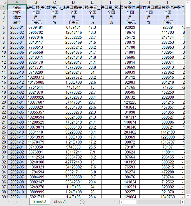 指标 机电产品进口额(美元)_当期 机电产品进口额(美元)_当期同比增速 机电产品进口额(美元)_累计 机电产品进口额(美元)_累计同比增速 机电产品进口量_累计同比增速 印刷、装订机械及其零件进口额(美元)_当期 印刷、装订机械及其零件进口额(美元)_当期同比增速 印刷、装订机械及其零件进口额(美元)_累计 印刷、装订机械及其零件进口额(美元)_累计同比增速 制造单晶柱或晶圆用的机器及装置进口额(美元)_当期 制造单晶柱或晶圆用的机器及装置进口额(美元)_当期同比增速 制造单晶柱或晶圆用的机器及装置进口额(美元)_累计 制造单晶柱或晶圆用的机器及装置进口额(美元)_累计同比增速 制造半导体器件或集成电路用的机器及装置进口额(美元)_当期 制造半导体器件或集成电路用的机器及装置进口额(美元)_当期同比增速 制造半导体器件或集成电路用的机器及装置进口额(美元)_累计 制造半导体器件或集成电路用的机器及装置进口额(美元)_累计同比增速 平板显示器件(FPD)生产设备进口额(美元)_当期 平板显示器件(FPD)生产设备进口额(美元)_当期同比增速 平板显示器件(FPD)生产设备进口额(美元)_累计 平板显示器件(FPD)生产设备进口额(美元)_累计同比增速 医疗仪器及器械进口额(美元)_当期 医疗仪器及器械进口额(美元)_当期同比增速 医疗仪器及器械进口额(美元)_累计 医疗仪器及器械进口额(美元)_累计同比增速 制造单晶柱或晶圆用的机器及装置进口量_当期 制造单晶柱或晶圆用的机器及装置进口量_当期同比增速 制造单晶柱或晶圆用的机器及装置进口量_累计 制造单晶柱或晶圆用的机器及装置进口量_累计同比增速 制造半导体器件或集成电路用的机器及装置进口量_当期 制造半导体器件或集成电路用的机器及装置进口量_当期同比增速 制造半导体器件或集成电路用的机器及装置进口量_累计 制造半导体器件或集成电路用的机器及装置进口量_累计同比增速 平板显示器件(FPD)生产设备进口量_当期 平板显示器件(FPD)生产设备进口量_当期同比增速 平板显示器件(FPD)生产设备进口量_累计 平板显示器件(FPD)生产设备进口量_累计同比增速 医疗仪器及器械进口量_累计同比增速