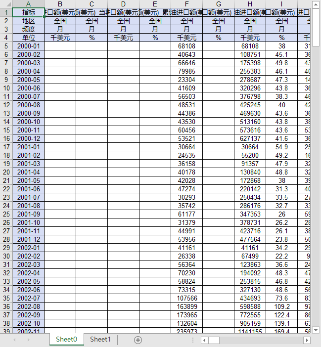 指标 粮食进口额(美元)_当期 粮食进口额(美元)_当期同比增速 粮食进口额(美元)_累计 粮食进口额(美元)_累计同比增速 食用植物油进口额(美元)_当期 食用植物油进口额(美元)_当期同比增速 食用植物油进口额(美元)_累计 食用植物油进口额(美元)_累计同比增速 棕榈油进口额(美元)_当期 棕榈油进口额(美元)_当期同比增速 棕榈油进口额(美元)_累计 棕榈油进口额(美元)_累计同比增速 豆油进口额(美元)_当期 豆油进口额(美元)_当期同比增速 豆油进口额(美元)_累计 豆油进口额(美元)_累计同比增速 菜子油和芥子油进口额(美元)_当期 菜子油和芥子油进口额(美元)_当期同比增速 菜子油和芥子油进口额(美元)_累计 菜子油和芥子油进口额(美元)_累计同比增速 食糖进口额(美元)_当期 食糖进口额(美元)_当期同比增速 食糖进口额(美元)_累计 食糖进口额(美元)_累计同比增速 冷冻鱼进口额(美元)_当期 冷冻鱼进口额(美元)_当期同比增速 冷冻鱼进口额(美元)_累计 冷冻鱼进口额(美元)_累计同比增速 粮食进口量_当期 粮食进口量_当期同比增速 粮食进口量_累计 粮食进口量_累计同比增速 食用植物油进口量_当期 食用植物油进口量_当期同比增速 食用植物油进口量_累计 食用植物油进口量_累计同比增速 棕榈油进口量_当期 棕榈油进口量_当期同比增速 棕榈油进口量_累计 棕榈油进口量_累计同比增速 豆油进口量_当期 豆油进口量_当期同比增速 豆油进口量_累计 豆油进口量_累计同比增速 菜子油和芥子油进口量_当期 菜子油和芥子油进口量_当期同比增速 菜子油和芥子油进口量_累计 菜子油和芥子油进口量_累计同比增速 食糖进口量_当期 食糖进口量_当期同比增速 食糖进口量_累计 食糖进口量_累计同比增速 冷冻鱼进口量_当期 冷冻鱼进口量_当期同比增速 冷冻鱼进口量_累计 冷冻鱼进口量_累计同比增速 啤酒进口额(美元)_当期 啤酒进口额(美元)_当期同比增速 啤酒进口额(美元)_累计 啤酒进口额(美元)_累计同比增速 葡萄酒进口额(美元)_当期 葡萄酒进口额(美元)_当期同比增速 葡萄酒进口额(美元)_累计 葡萄酒进口额(美元)_累计同比增速 啤酒进口量_当期 啤酒进口量_当期同比增速 啤酒进口量_累计 啤酒进口量_累计同比增速 葡萄酒进口量_当期 葡萄酒进口量_当期同比增速 葡萄酒进口量_累计 葡萄酒进口量_累计同比增速