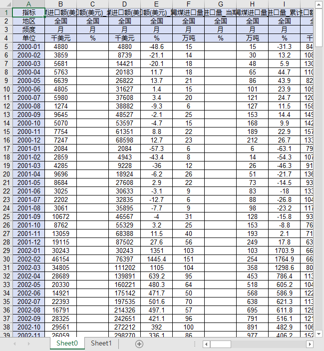 指标 煤及褐煤进口额(美元)_当期 煤及褐煤进口额(美元)_当期同比增速 煤及褐煤进口额(美元)_累计 煤及褐煤进口额(美元)_累计同比增速 煤及褐煤进口量_当期 煤及褐煤进口量_当期同比增速 煤及褐煤进口量_累计 煤及褐煤进口量_累计同比增速 原油进口额(美元)_当期 原油进口额(美元)_当期同比增速 原油进口额(美元)_累计 原油进口额(美元)_累计同比增速 液化天然气进口额(美元)_当期 液化天然气进口额(美元)_当期同比增速 液化天然气进口额(美元)_累计 液化天然气进口额(美元)_累计同比增速 原油进口量_当期 原油进口量_当期同比增速 原油进口量_累计 原油进口量_累计同比增速 液化天然气进口量_当期 液化天然气进口量_当期同比增速 液化天然气进口量_累计 液化天然气进口量_累计同比增速 铁矿砂及其精矿进口额(美元)_当期 铁矿砂及其精矿进口额(美元)_当期同比增速 铁矿砂及其精矿进口额(美元)_累计 铁矿砂及其精矿进口额(美元)_累计同比增速 铁矿砂及其精矿进口量_当期 铁矿砂及其精矿进口量_当期同比增速 铁矿砂及其精矿进口量_累计 铁矿砂及其精矿进口量_累计同比增速 铜矿砂及其精矿进口额(美元)_当期 铜矿砂及其精矿进口额(美元)_当期同比增速 铜矿砂及其精矿进口额(美元)_累计 铜矿砂及其精矿进口额(美元)_累计同比增速 铜矿砂及其精矿进口量_当期 铜矿砂及其精矿进口量_当期同比增速 铜矿砂及其精矿进口量_累计 铜矿砂及其精矿进口量_累计同比增速
