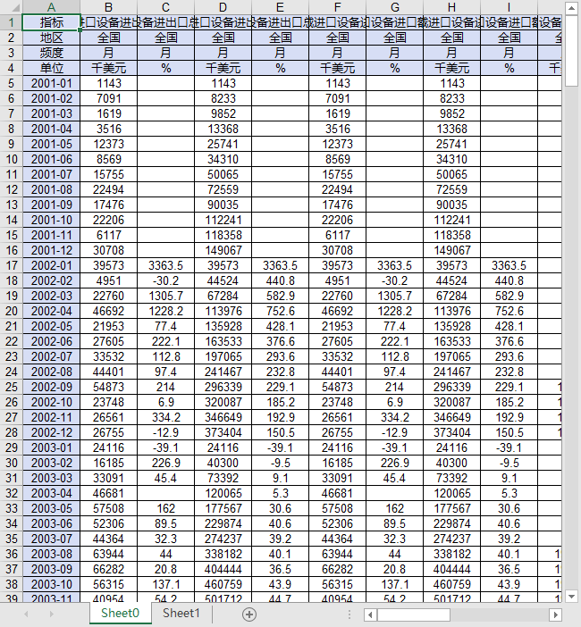 指标 海关特殊监管区域进口设备进出口总额(美元)_当期 海关特殊监管区域进口设备进出口总额(美元)_当期同比增速 海关特殊监管区域进口设备进出口总额(美元)_累计 海关特殊监管区域进口设备进出口总额(美元)_累计同比增速 海关特殊监管区域进口设备进口额(美元)_当期 海关特殊监管区域进口设备进口额(美元)_当期同比增速 海关特殊监管区域进口设备进口额(美元)_累计 海关特殊监管区域进口设备进口额(美元)_累计同比增速 海关特殊监管区域进口设备进口额(美元)_国有企业_累计 海关特殊监管区域进口设备进口额(美元)_国有企业_累计同比增速 海关特殊监管区域进口设备进口额(美元)_私营企业_累计 海关特殊监管区域进口设备进口额(美元)_私营企业_累计同比增速 海关特殊监管区域进口设备进口额(美元)_外商投资企业_累计 海关特殊监管区域进口设备进口额(美元)_外商投资企业_累计同比增速 海关特殊监管区域进口设备进口额(美元)_中外合资经营企业_累计 海关特殊监管区域进口设备进口额(美元)_中外合资经营企业_累计同比增速 海关特殊监管区域进口设备进口额(美元)_中外合作经营企业_累计 海关特殊监管区域进口设备进口额(美元)_中外合作经营企业_累计同比增速 海关特殊监管区域进口设备进口额(美元)_外资(独资)企业_累计 海关特殊监管区域进口设备进口额(美元)_外资(独资)企业_累计同比增速