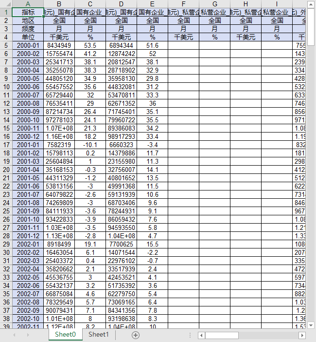 指标 出口额(美元)_国有企业_累计 出口额(美元)_国有企业_累计同比增速 进口额(美元)_国有企业_累计 进口额(美元)_国有企业_累计同比增速 出口额(美元)_私营企业_累计 出口额(美元)_私营企业_累计同比增速 进口额(美元)_私营企业_累计 进口额(美元)_私营企业_累计同比增速 出口额(美元)_外商投资企业_累计 出口额(美元)_外商投资企业_累计同比增速 进口额(美元)_外商投资企业_累计 进口额(美元)_外商投资企业_累计同比增速 出口额(美元)_中外合资经营企业_累计 出口额(美元)_中外合资经营企业_累计同比增速 进口额(美元)_中外合资经营企业_累计 进口额(美元)_中外合资经营企业_累计同比增速 出口额(美元)_中外合作经营企业_累计 出口额(美元)_中外合作经营企业_累计同比增速 进口额(美元)_中外合作经营企业_累计 进口额(美元)_中外合作经营企业_累计同比增速 出口额(美元)_外资(独资)企业_累计 出口额(美元)_外资(独资)企业_累计同比增速 进口额(美元)_外资(独资)企业_累计 进口额(美元)_外资(独资)企业_累计同比增速