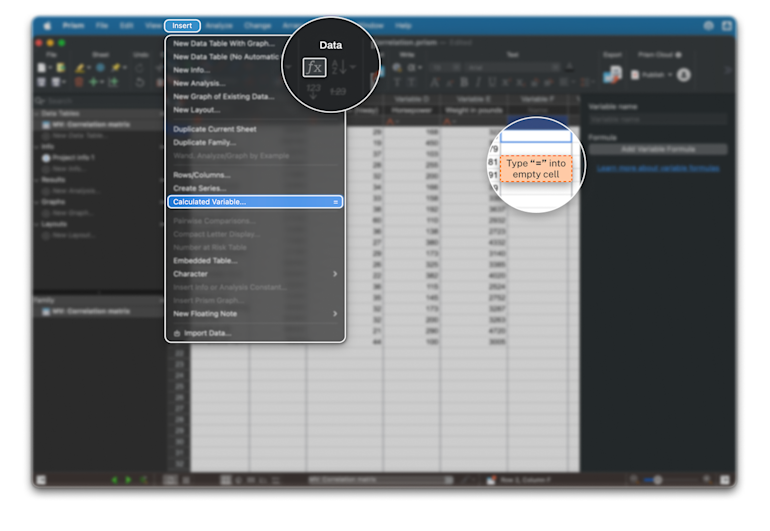 这是Prism中最受用户需求的功能之一。此前,像比率计算或对数转换这类简单操作,都需要创建独立的分析工作表,这会让导航栏变得杂乱,也难以追踪工作流。现在,您可以直接在数据表中通过公式完成这些转换,且公式会自动更新,就像Excel或Google Sheets中操作一样。这能大幅节省日常数据预处理的时间,并让项目保持有序。