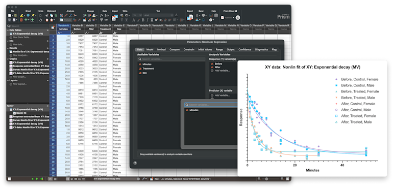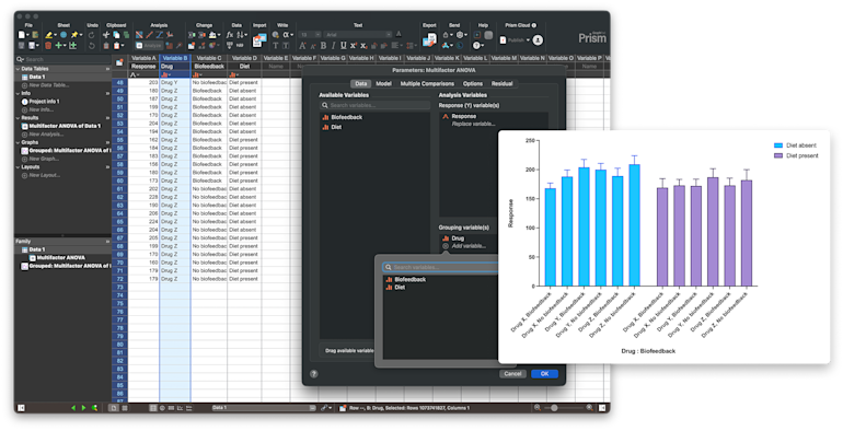 此前,t检验需要列数据表,非线性回归需要XY数据表,而生存分析则需要生存数据表。如果在一次实验中测量了多个变量,就必须为每个分析创建独立的表格,或确保数据结构能适配每种检验。现在,您只需在一张多变量数据表中组织数据,然后通过分配变量即可运行任意分析,无需重新格式化。本版本已包含三种核心分析类型,未来版本还将扩展这一框架。当然,您仍可像以往一样直接使用列、XY或生存数据表,这一框架只是为您提供了更多数据结构上的灵活性。
