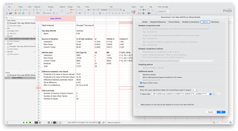 Prism现在会自动计算并报告此前需要手动计算或借助其他软件查询的效应量。这一更新使Prism符合现代发表标准,许多期刊现在要求在报告P值的同时提供效应量。将这些指标直接内置到结果中,可节省时间,并确保您无需额外步骤即可满足当前最佳实践。