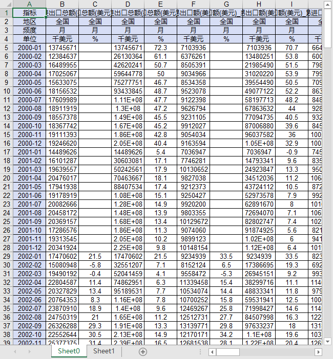 指标 一般贸易进出口总额(美元)_当期 一般贸易进出口总额(美元)_当期同比增速 一般贸易进出口总额(美元)_累计 一般贸易进出口总额(美元)_累计同比增速 一般贸易出口额(美元)_当期 一般贸易出口额(美元)_当期同比增速 一般贸易出口额(美元)_累计 一般贸易出口额(美元)_累计同比增速 一般贸易进口额(美元)_当期 一般贸易进口额(美元)_当期同比增速 一般贸易进口额(美元)_累计 一般贸易进口额(美元)_累计同比增速 一般贸易出口额(美元)_国有企业_累计 一般贸易出口额(美元)_国有企业_累计同比增速 一般贸易进口额(美元)_国有企业_累计 一般贸易进口额(美元)_国有企业_累计同比增速 一般贸易出口额(美元)_私营企业_累计 一般贸易出口额(美元)_私营企业_累计同比增速 一般贸易进口额(美元)_私营企业_累计 一般贸易进口额(美元)_私营企业_累计同比增速 一般贸易出口额(美元)_外商投资企业_累计 一般贸易出口额(美元)_外商投资企业_累计同比增速 一般贸易进口额(美元)_外商投资企业_累计 一般贸易进口额(美元)_外商投资企业_累计同比增速 一般贸易出口额(美元)_中外合资经营企业_累计 一般贸易出口额(美元)_中外合资经营企业_累计同比增速 一般贸易进口额(美元)_中外合资经营企业_累计 一般贸易进口额(美元)_中外合资经营企业_累计同比增速 一般贸易出口额(美元)_中外合作经营企业_累计 一般贸易出口额(美元)_中外合作经营企业_累计同比增速 一般贸易进口额(美元)_中外合作经营企业_累计 一般贸易进口额(美元)_中外合作经营企业_累计同比增速 一般贸易出口额(美元)_外资(独资)企业_累计 一般贸易出口额(美元)_外资(独资)企业_累计同比增速 一般贸易进口额(美元)_外资(独资)企业_累计 一般贸易进口额(美元)_外资(独资)企业_累计同比增速