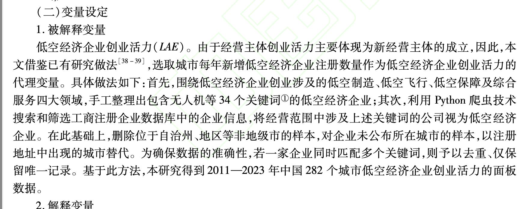 2、测算方式:参考c刊《广东财经大学学报》张林(2026)老师的做法,低空经济企业创业活力( L A E ) 。由于经营主体创业活力主要体现为新经营主体的成立, 因此, 本文借鉴已有研究做法, 选取城市每年新增低空经济企业注册数量作为低空经济企业创业活力的代理变量。具体做法如下: 首先, 围绕低空经济企业创业涉及的低空制造、 低空飞行、 低空保障及综合服务四大领域, 手工整理出包含无人机等 34个关键词的低空经济企业; 其次, 利用 P y t h o n 爬虫技术搜索和筛选工商注册企业数据库中的企业信息, 将经营范围中涉及上述关键词的公司视为低空经济企业。在此基础上, 删除位于自治州、 地区等非地级市的样本, 对企业未公布所在城市的样本, 以注册地址中出现的城市替代。为确保数据的准确性, 若一家企业同时匹配多个关键词, 则予以去重、 仅保留唯一记录。