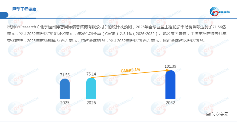 根据QYResearch最新调研报告显示,预计2032年全球巨型工程轮胎市场规模将达到10139百万美元,未来几年年复合增长率CAGR为5.12%。