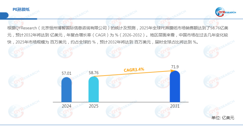 在包装材料领域,企业正面临环保政策趋严与市场需求升级的双重挑战。传统包装材料因难以降解,面临被淘汰风险,而兼具功能性与环保性的新型材料成为转型关键。PE淋膜纸凭借防水、防油、耐磨等特性,在食品包装、工业防潮等领域广泛应用,成为众多企业关注的焦点。QYResearch调研显示,2025年全球PE淋膜纸市场规模大约为58.76亿美元,预计2032年将达到74.11亿美元,2026-2032期间年复合增长率(CAGR)为3.4%。
