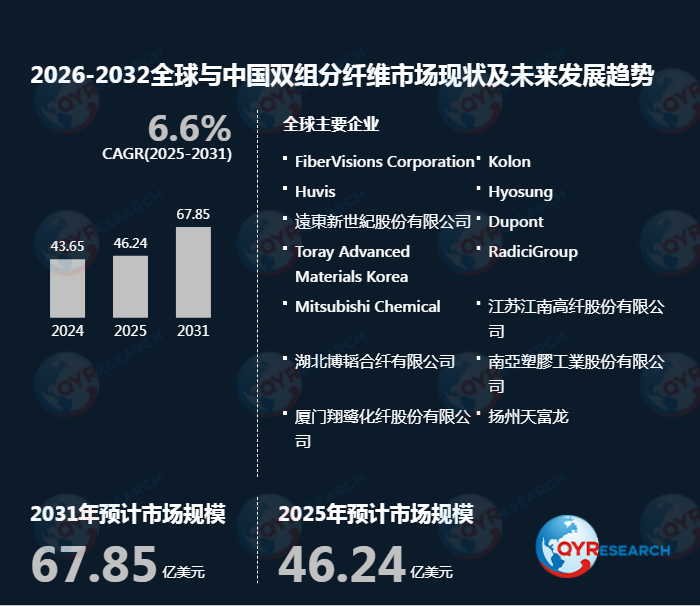 QYResearch调研显示,2025年全球双组分纤维市场规模大约为46.24亿美元,预计2032年将达到71.88亿美元,2026-2032期间年复合增长率(CAGR)为6.6%。