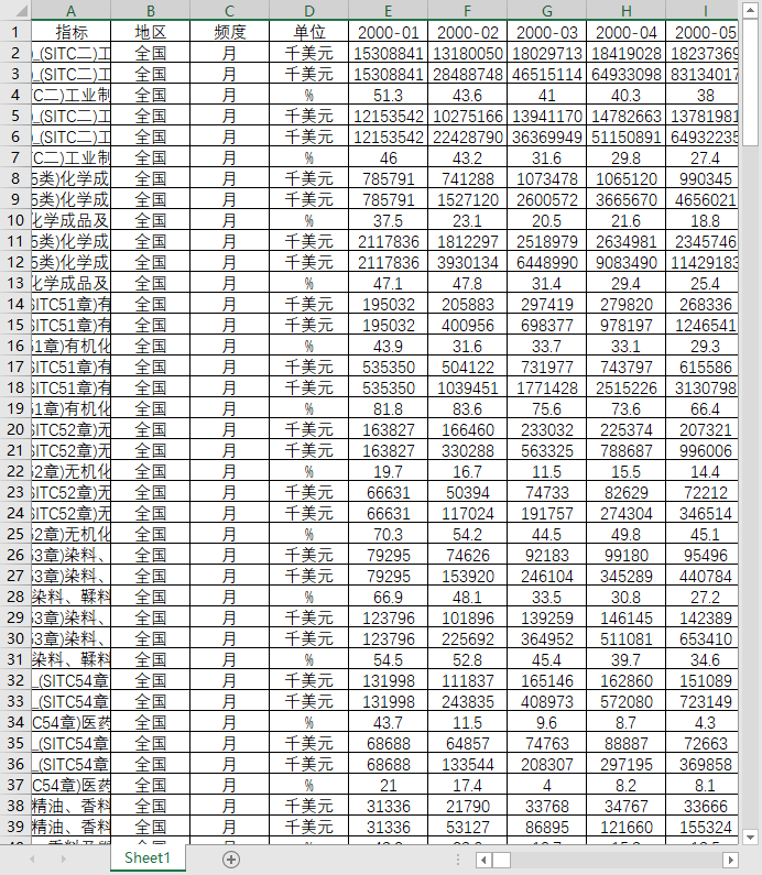 包含如下指标的进出口数据: