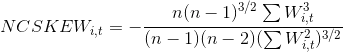 其次,在公司日特质收益率的基础上构建两个度量股价崩盘风险的指标。一 是使用负收益偏态系数(NCSKEW)来度量股价崩盘风险。具体公式为: